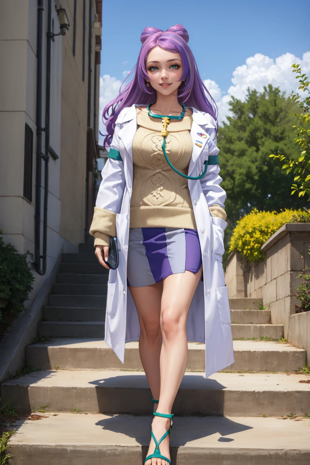 earrings, labcoat, stethoscope, sweater, purple skirt