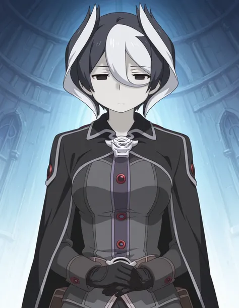 Ozen: ozen, black eyes, empty eyes, white hair, two-tone hair, short hair, hair between eyes, black cape, long sleeves, black gloves, tall female -----