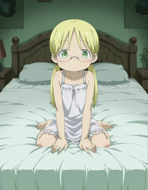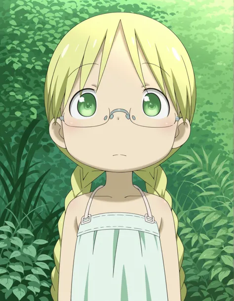 Riko: riko \(made in abyss\), blonde hair, green eyes, semi-rimless eyewear, long hair, low twintails | long hair, twin braids | very short hair, sidelocks   ----