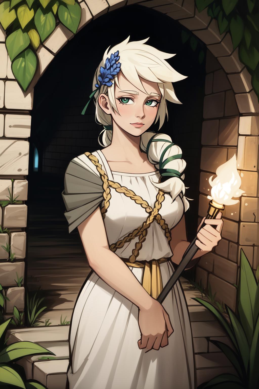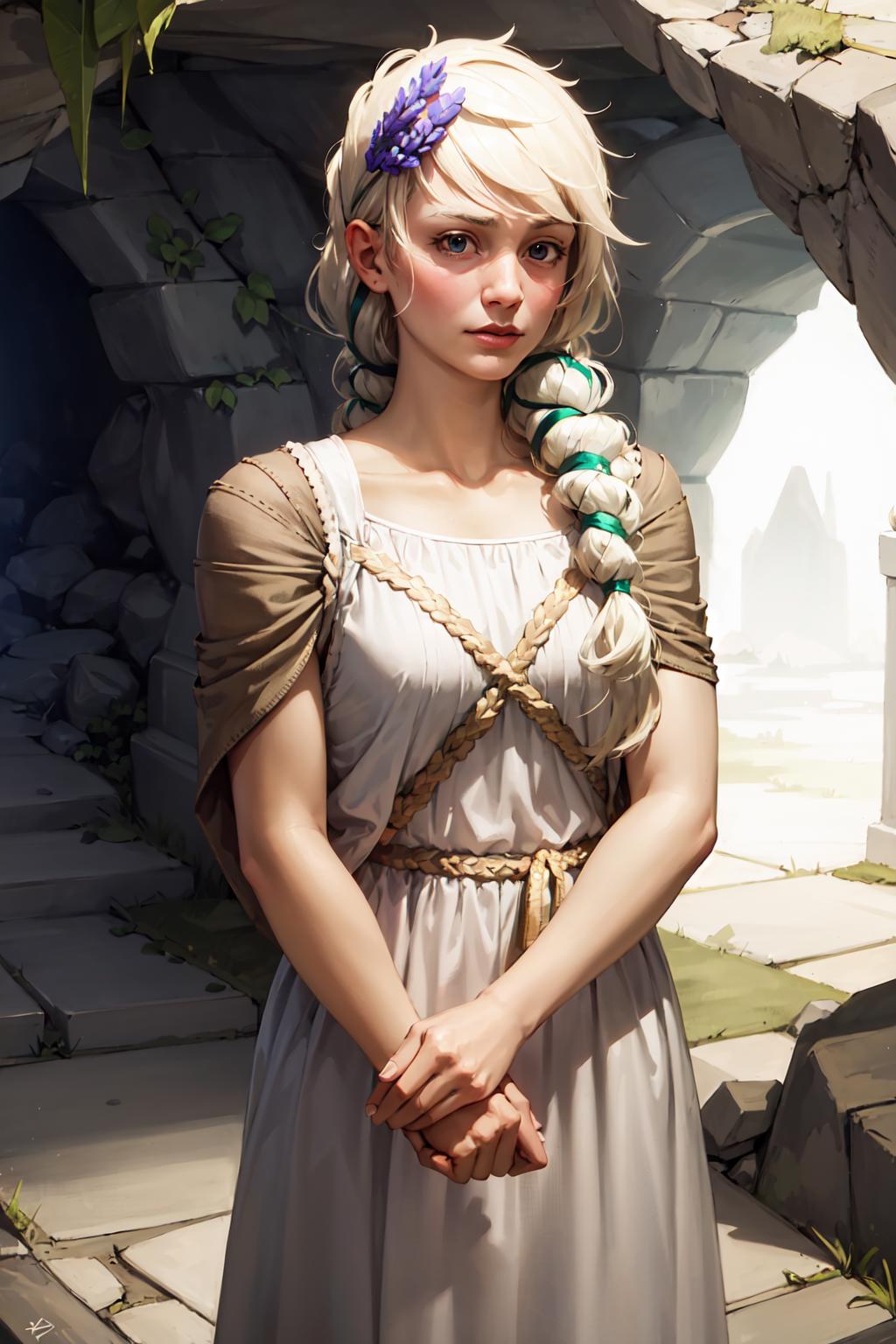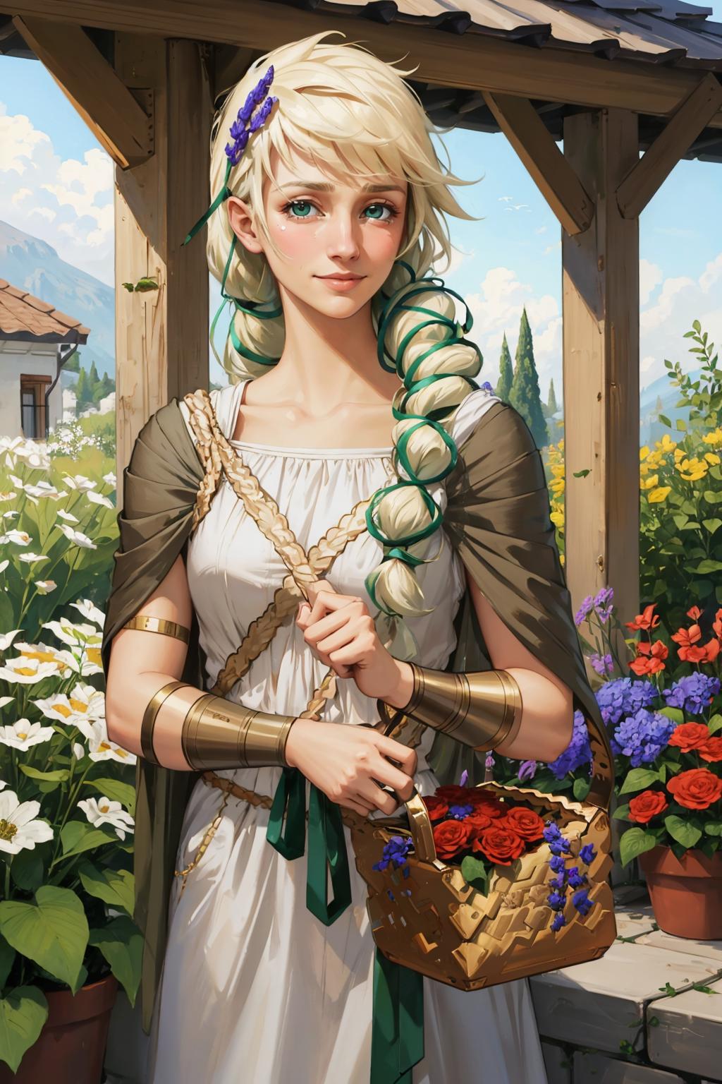 Add "greek clothes, hair flower, mature woman" for her typical look.