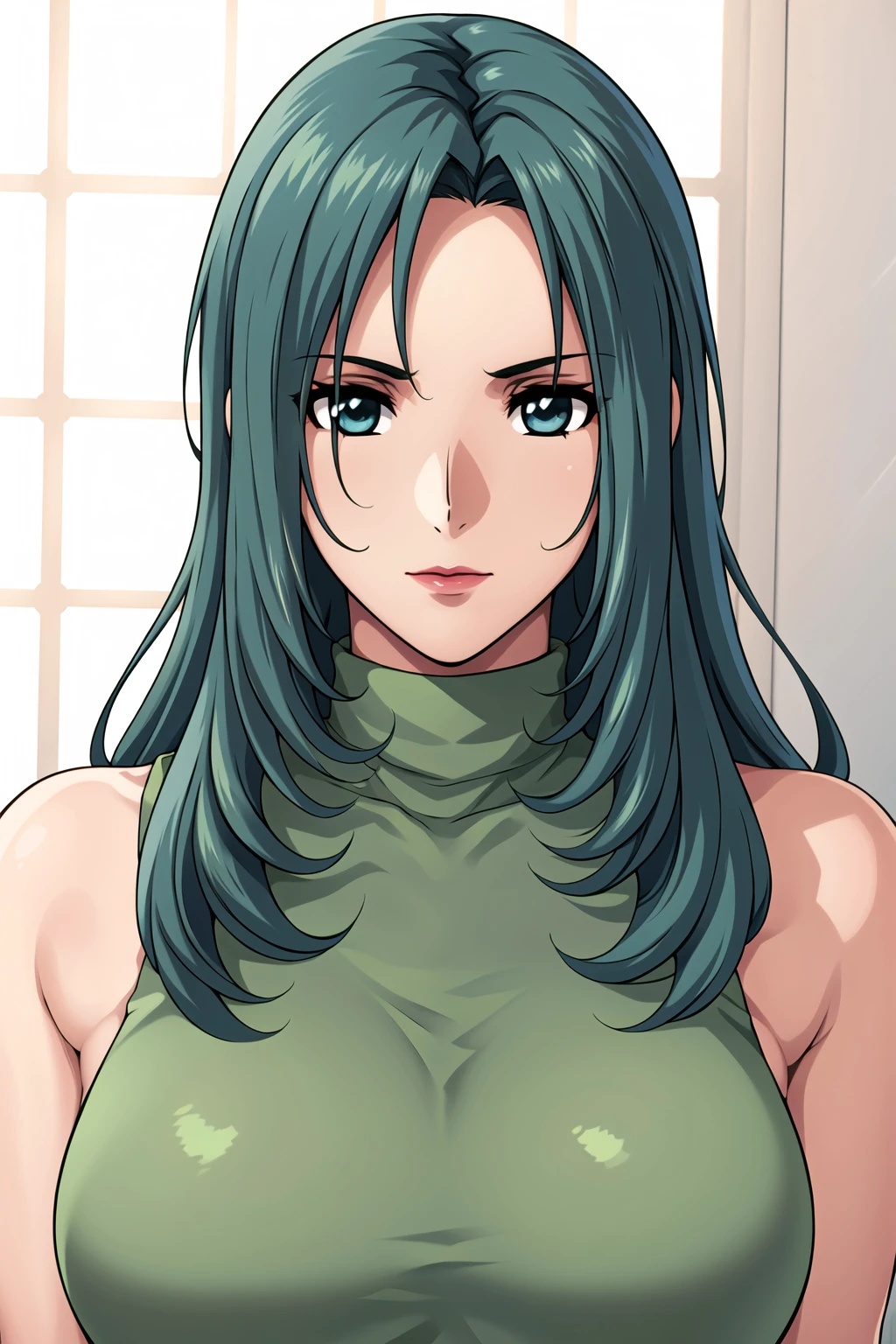 green shirt, sleeveless, ???? shoulders, turtleneck,