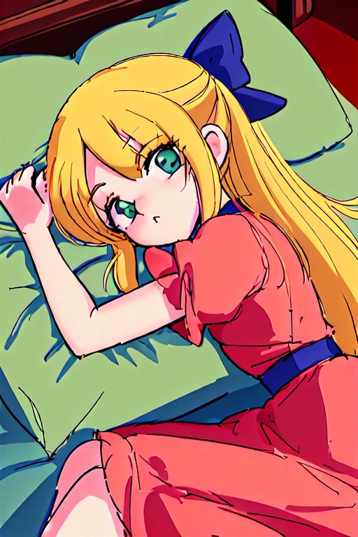 Green bow, blonde hair, red dress, blue eyes, Roll3D