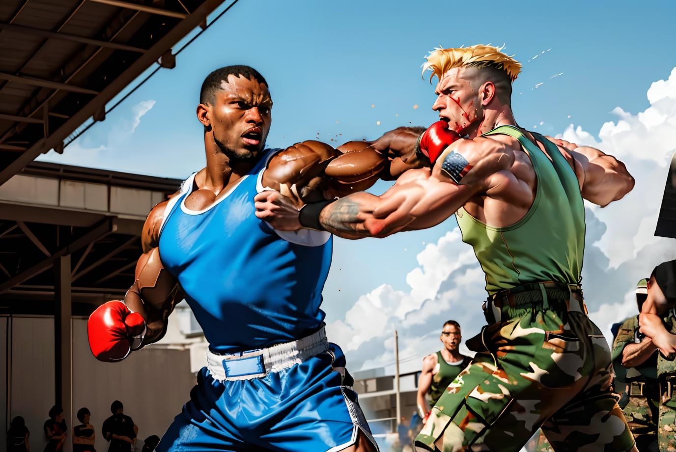 Keywords: (boxing gloves), (blue sleeveless t-shirt), (blue shorts), (boots), (). His hairstyle works depending on the model you are using. I wasn't able to include the missing teeth. Use (boxing gloves) on negative prompt to remove his gloves.