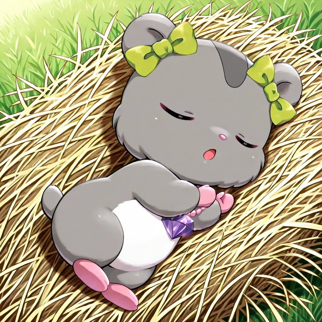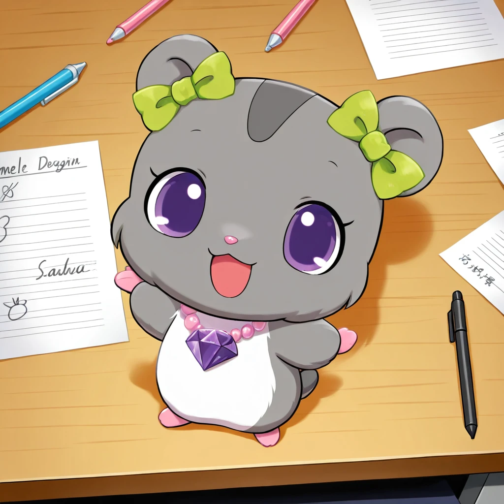 furry, female, hamster, chibi, (very small body, micro view), feral, light grey body, light grey fur, dark grey pattern, green headbow, pink pearl necklace, purple gem, white stomach, pink toes, grey tail, no eyebrows, purple eyes
