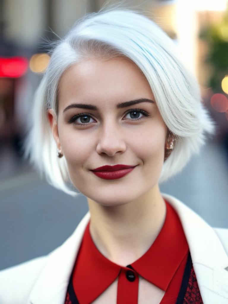 "a young woman with white hair wearing a red fashionable in front of a busy street and looking at the camera, medium close-up shot"