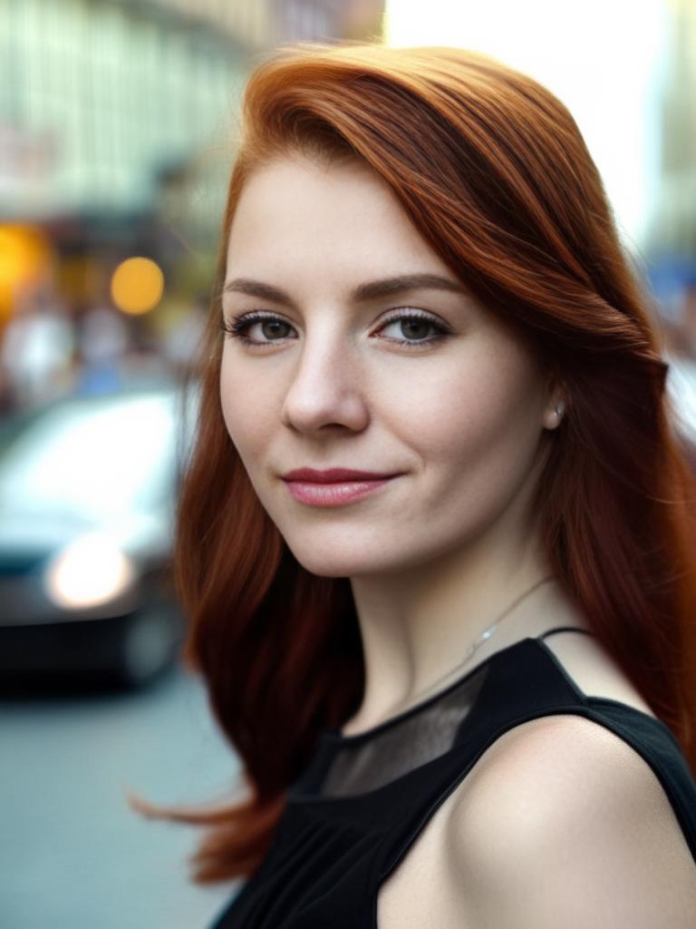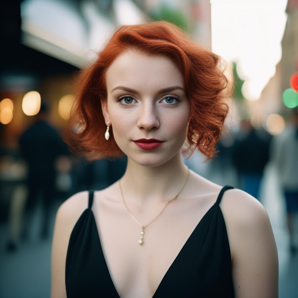 "a young woman with red hair wearing a black dress in front of a busy street and looking at the camera, medium close-up shot"