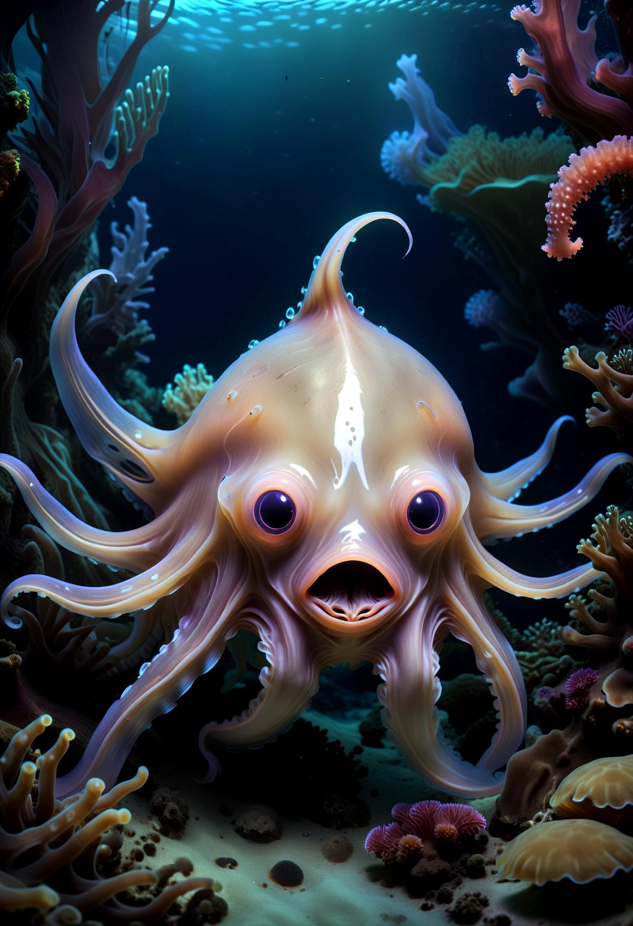 A Grimpoteuthis, also known as a "Dumbo octopus," is a type of deep-sea umbrella octopus. The name comes from its ear-like fins protruding from the top of its head-like body, resembling the ears of Disney's Dumbo the Elephant. These octopuses live in extreme depths, often several thousand meters below sea level, where pressure is high and light is scarce. They're known for their unique method of propulsion: instead of jet propulsion like most octopuses, they flap their ear-like fins to move around. Grimpoteuthis species vary in size and color, but they typically have a soft, bell-shaped body. Their diet consists mainly of crustaceans and worms found on the ocean floor. They're interesting creatures due to their rare habitat and distinctive appearance.