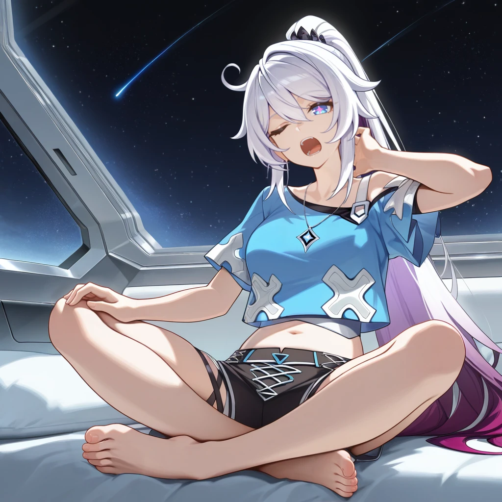 KianaHoFinHi3, Khf_Paj, pink pupils, long hair, symbol-shaped pupils, blue eyes, kiana kaslana, gradient hair, ponytail, white hair, purple hair, light blue shirt, cross print, single-shoulder shirt, short sleeves, light blue sleeves, cropped shirt, pendant, single off shoulder, single ???? shoulder, cross-laced shorts, black shorts, midriff, navel, white strap, shoulder strap, barefoot,