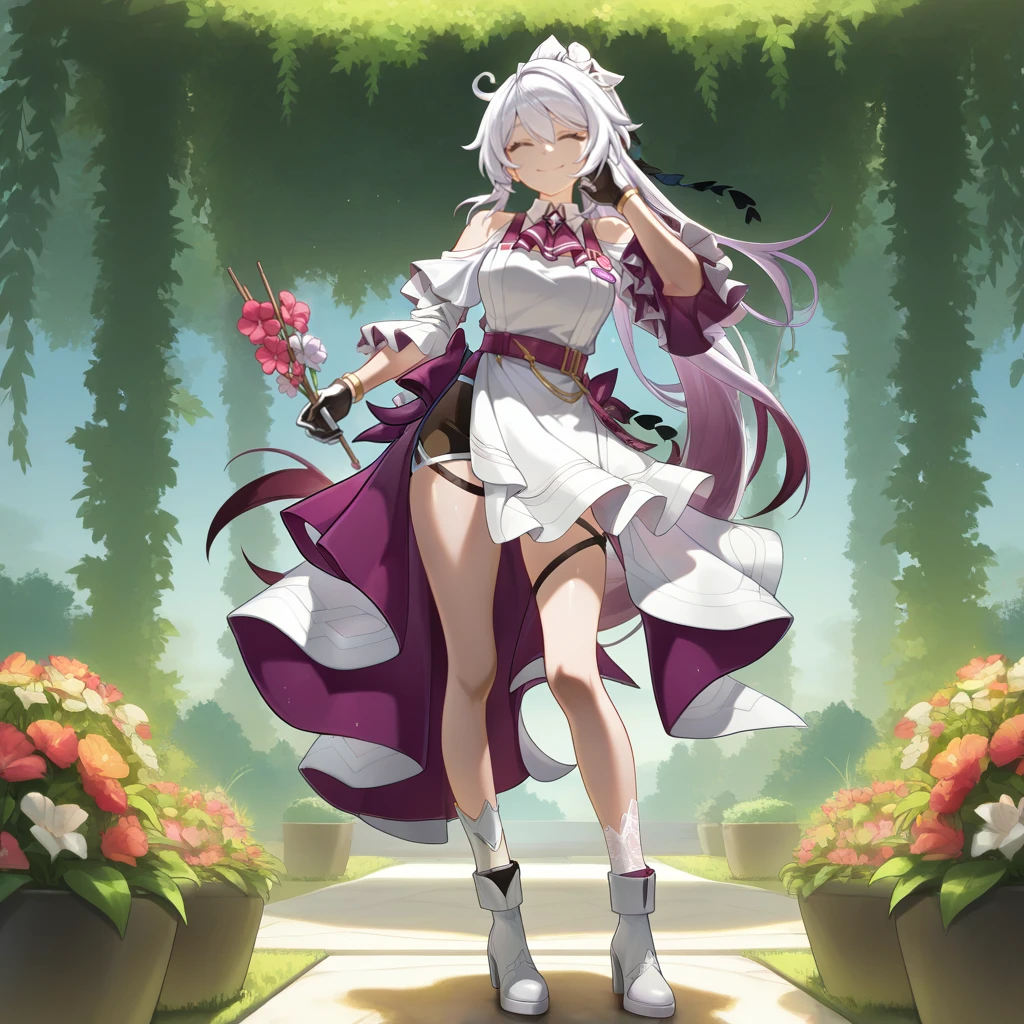 KianaHoFinHi3, Khf_Anv, pink pupils, long hair, symbol-shaped pupils, blue eyes,  kiana kaslana, white hair, purple hair, gradient hair, white apron, apron, ponytail, white ribbon, hair ribbon, white shirt, collared shirt, shoulder cutout, ???? shoulders, two-sided sleeves, white sleeves, purple sleeves, frilled sleeves, purple belt, shoulder belt, pin, purple ascot, frilled ascot, two-sided gloves, black gloves, white gloves, gold bracelet, long skirt, two-sided skirt, side slit, black shorts, shorts under skirt, big bow, purple bow, white footwear, high heel boots, white socks, single sock,