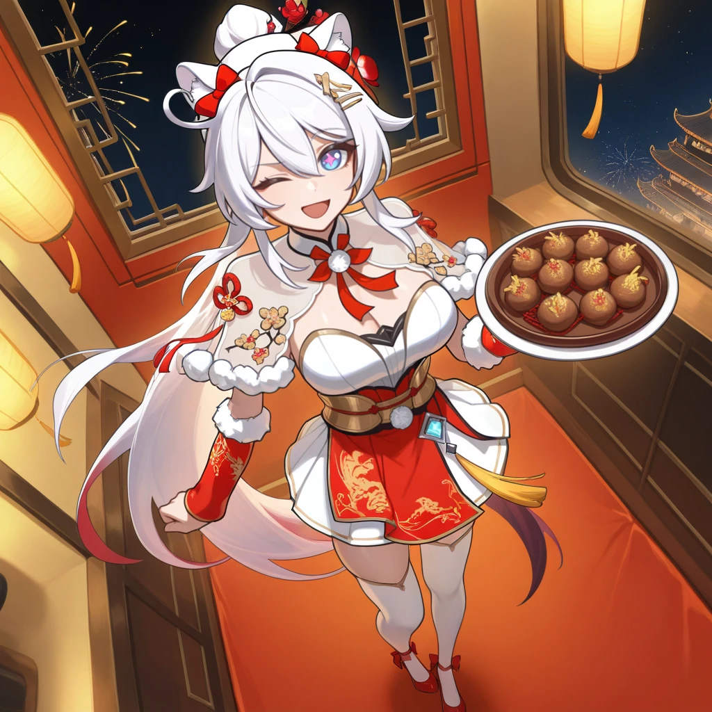 KianaHoFinHi3, Khf_CN, pink pupils, long hair, symbol-shaped pupils, blue eyes, kiana kaslana, chinese clothes, cat ears, see-through capelet, white capelet, fur-trimmed capelet, print capelet, white fur, branch print, hair branch, obi, hair flower, pleated dress, fur-trimmed arm warmers, red arm warmers, pom pom (clothes), neck ribbon, ear ribbon, red ribbon, emblem, yellow tassel, pleated skirt, white skirt, red dress, skirt under dress, gold corset, gold trim, thighhighs, white thighhighs, strapless dress, white bustier, red footwear, high heels, footwear bow, red bow, red ankle strap,