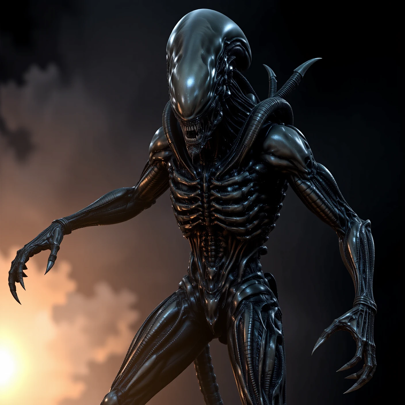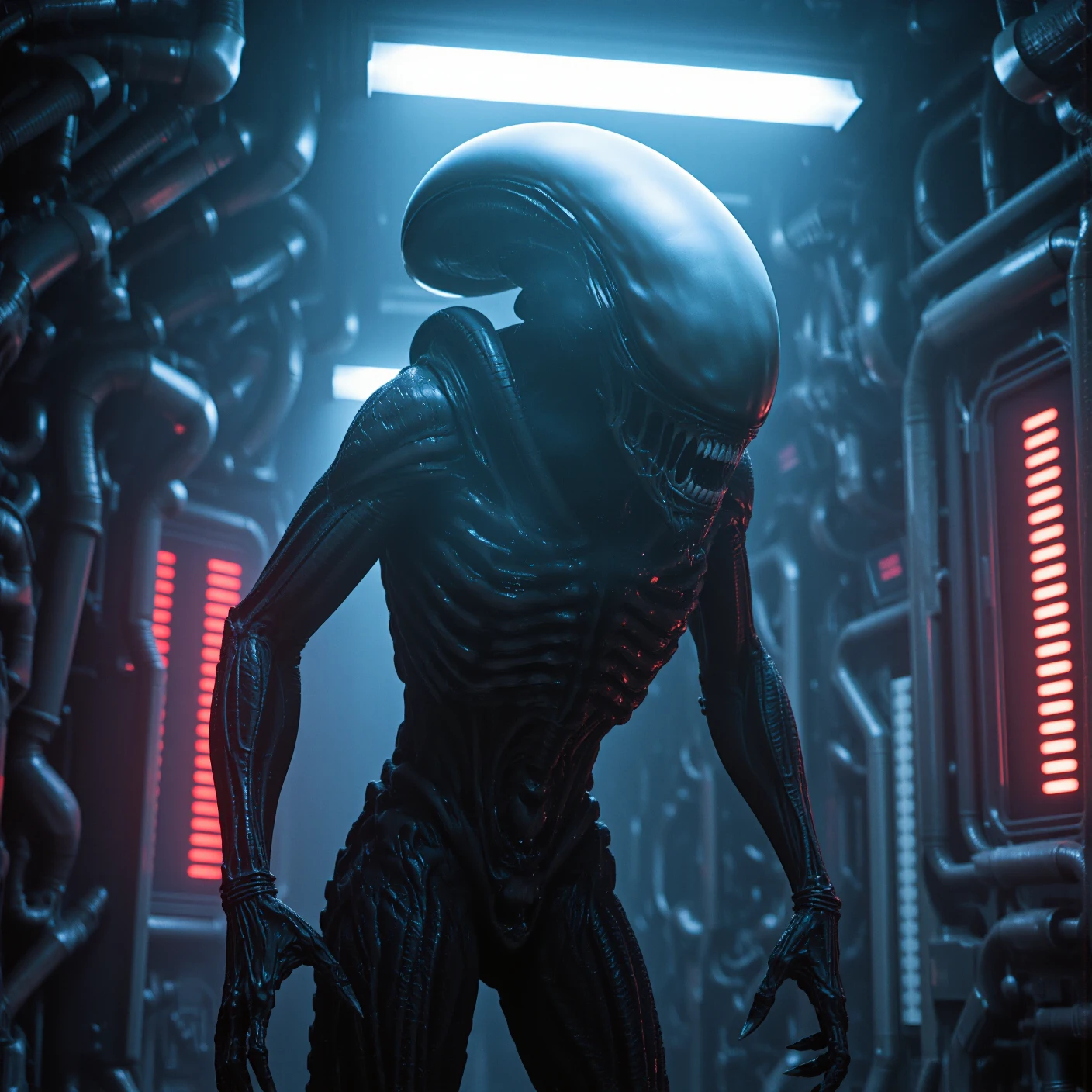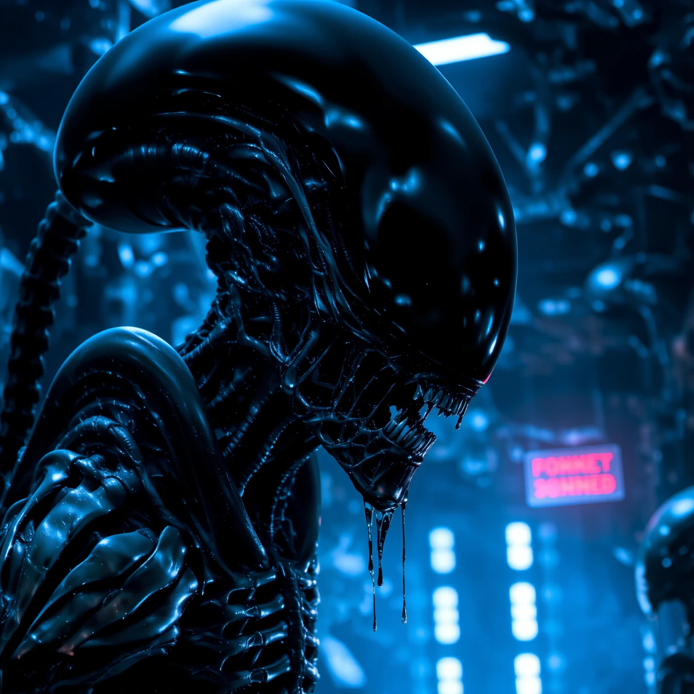In response, Weyland-Yutani's AI division has been tasked with the creation of a high-fidelity neural model capable of simulating the creature’s physical attributes and behavioral patterns. This system, designated FLUX_XENO, utilizes cutting-edge generative synthesis to replicate the Xenomorph’s visual structure with unparalleled accuracy, preserving key biomechanical details such as its elongated cranial structure, external ribbed carapace, and digitigrade locomotive adaptations. The model successfully reconstructs the creature’s signature dorsal spines and cranial dome translucency, with early iterations capturing even the photorealistic reflection properties of its chitinous surface.