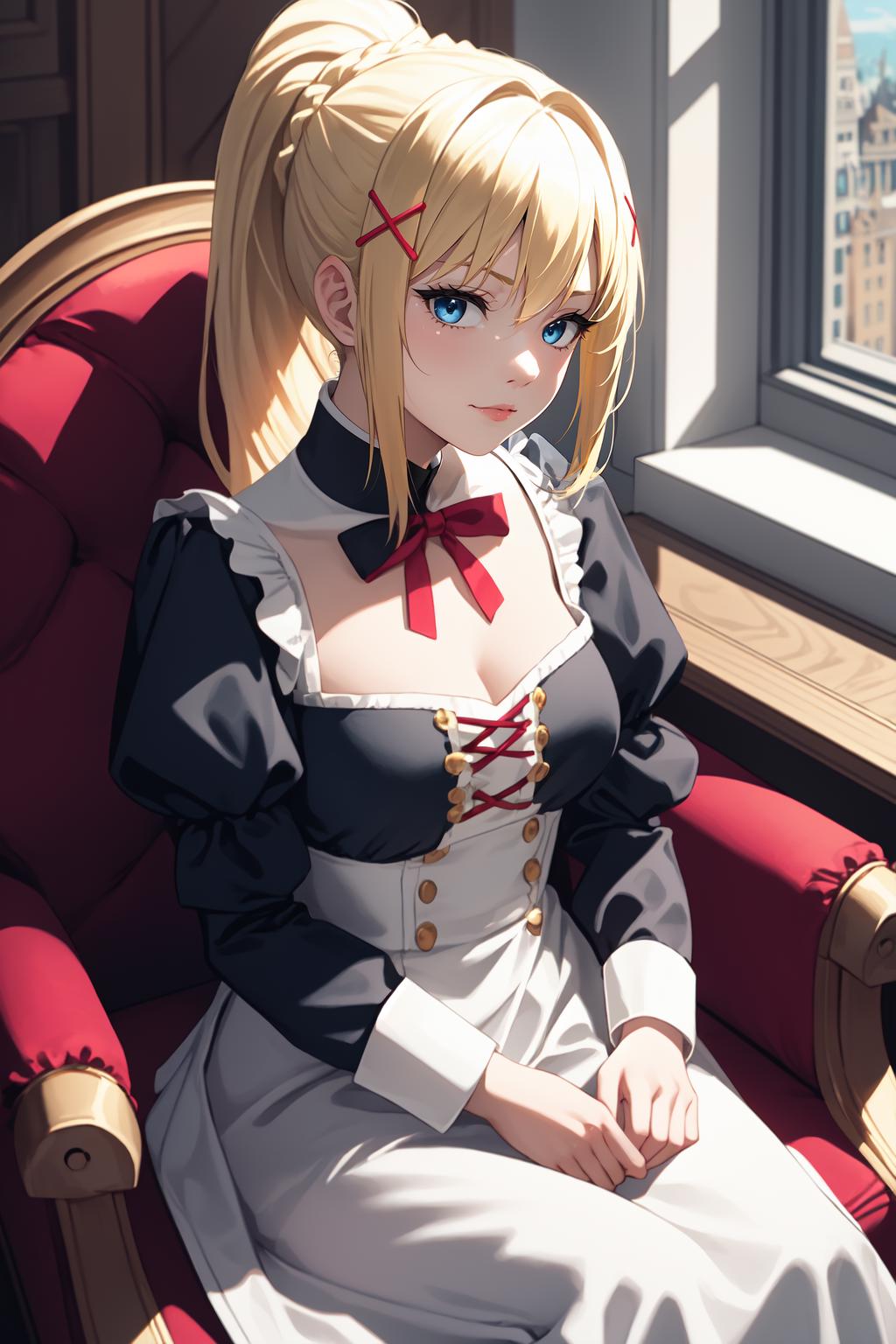 blonde hair, ponytail, x hair ornament, blue eyes