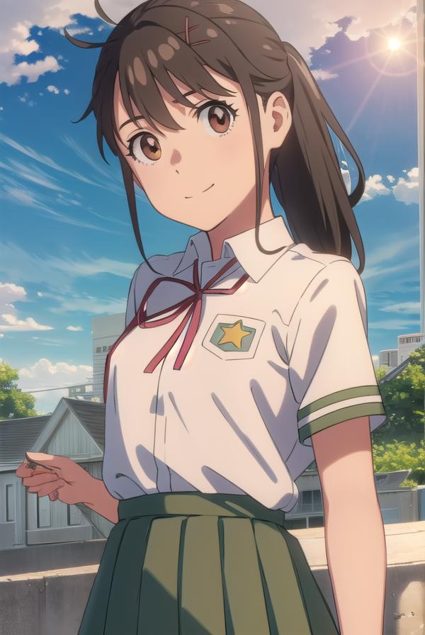 suzume iwato, black hair, (brown eyes:1.5), ponytail, hairclip, hair clip, hair pin,