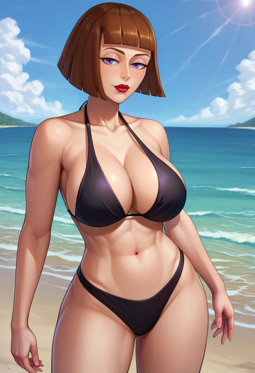 Maddie Fenton,1girl,solo,looking at viewer,short hair,mature female,large breasts,brown hair,purple eyes,black gloves,elbow gloves,blunt bangs,bodysuit,covered navel,turtleneck,bob cut,lipstick,skin tight,loose belt,belt,