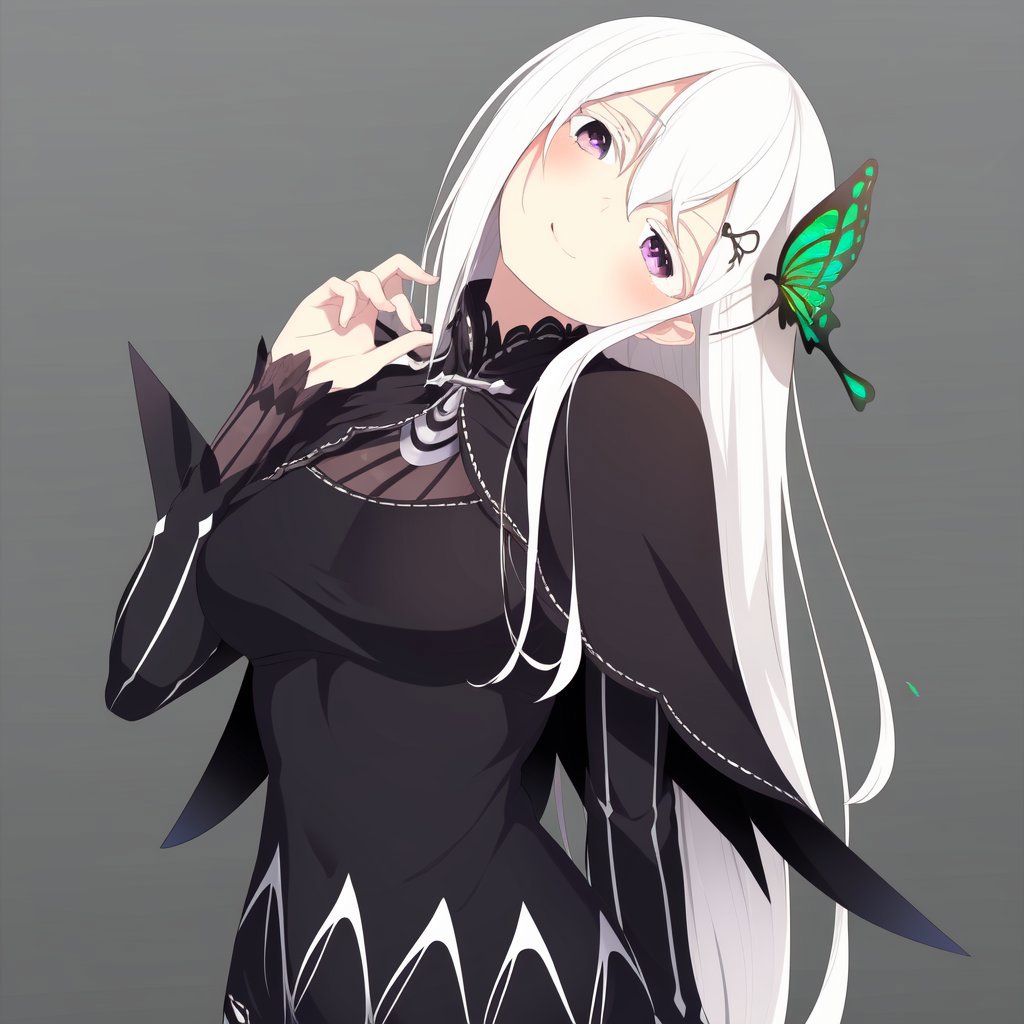 echidna, white hair, long hair, purple eyes, butterfly hair ornament, black dress, black capelet