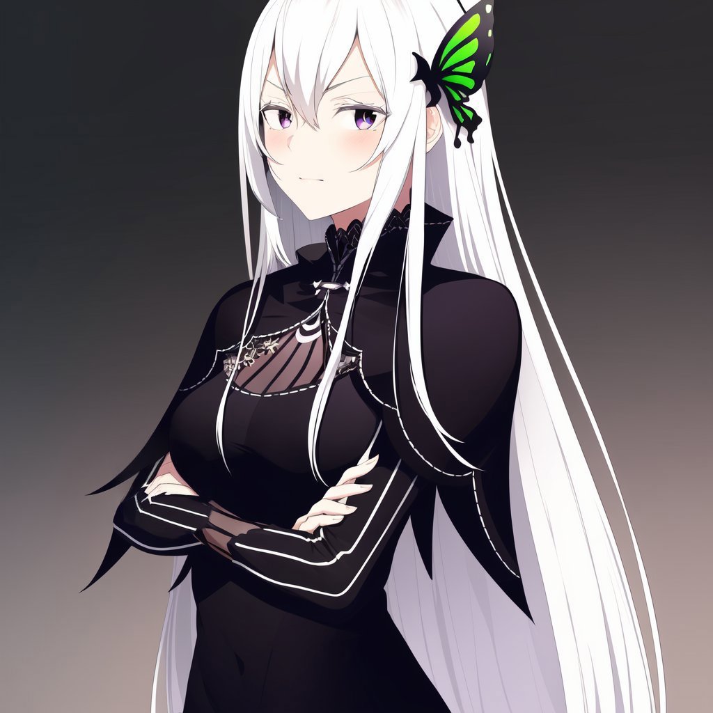 echidna, white hair, long hair, purple eyes, butterfly hair ornament, black dress, black capeletChange Uniform, replace black dress, black capelet with uniform of your choice, i.e. maid: