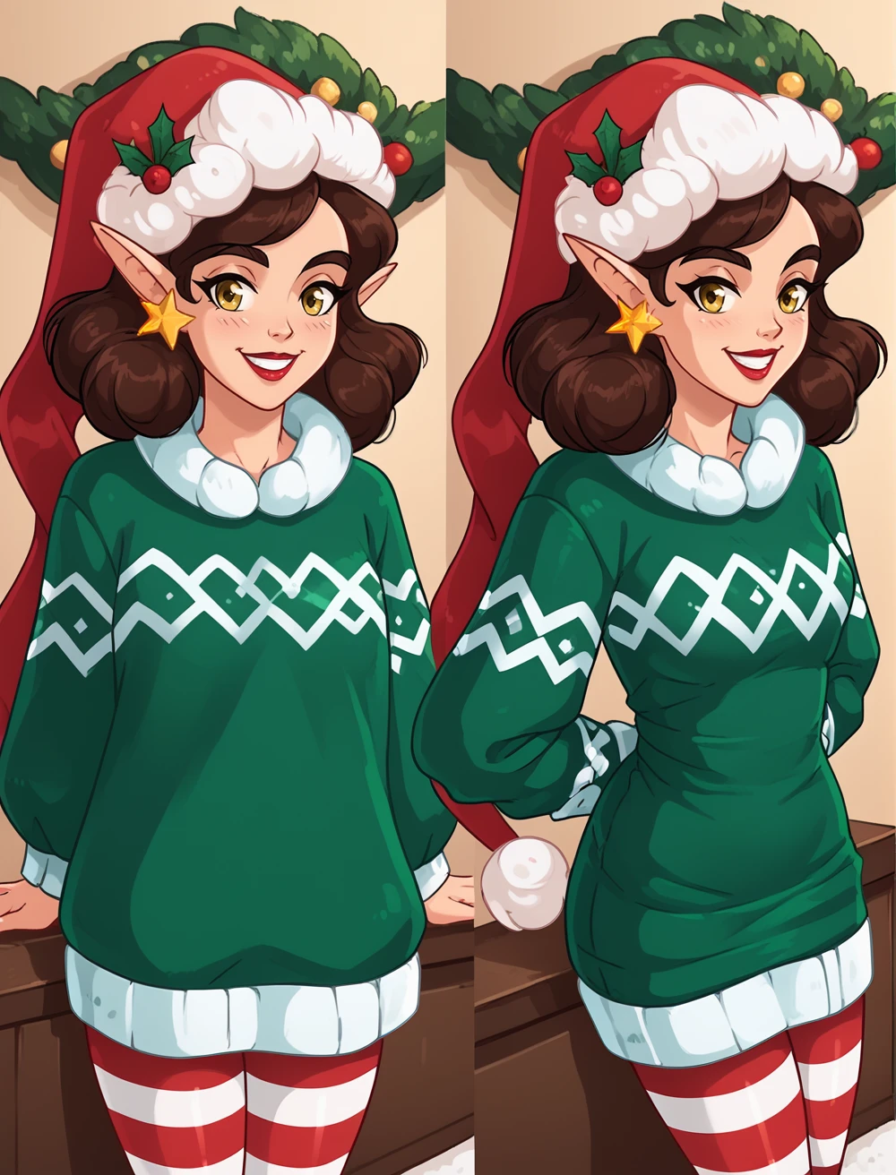 green sweater, striped pantyhose, santa hat, star earrings