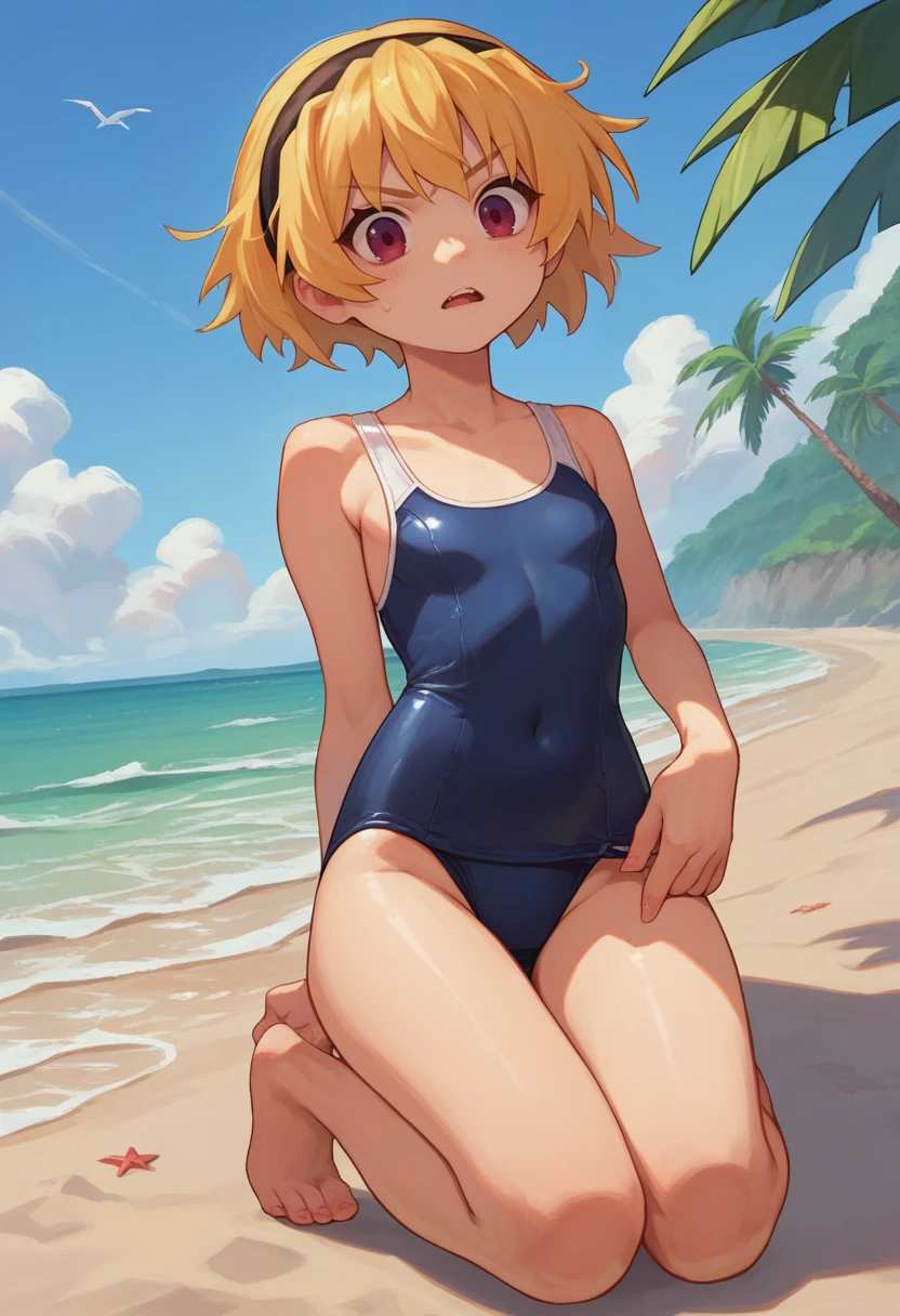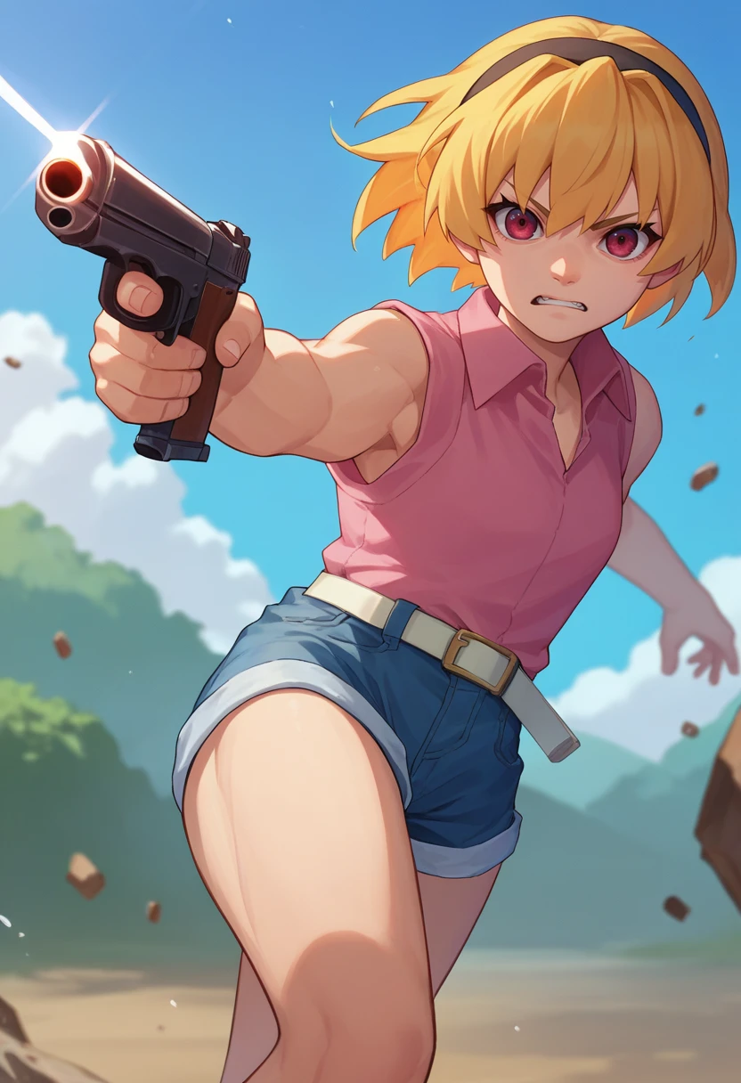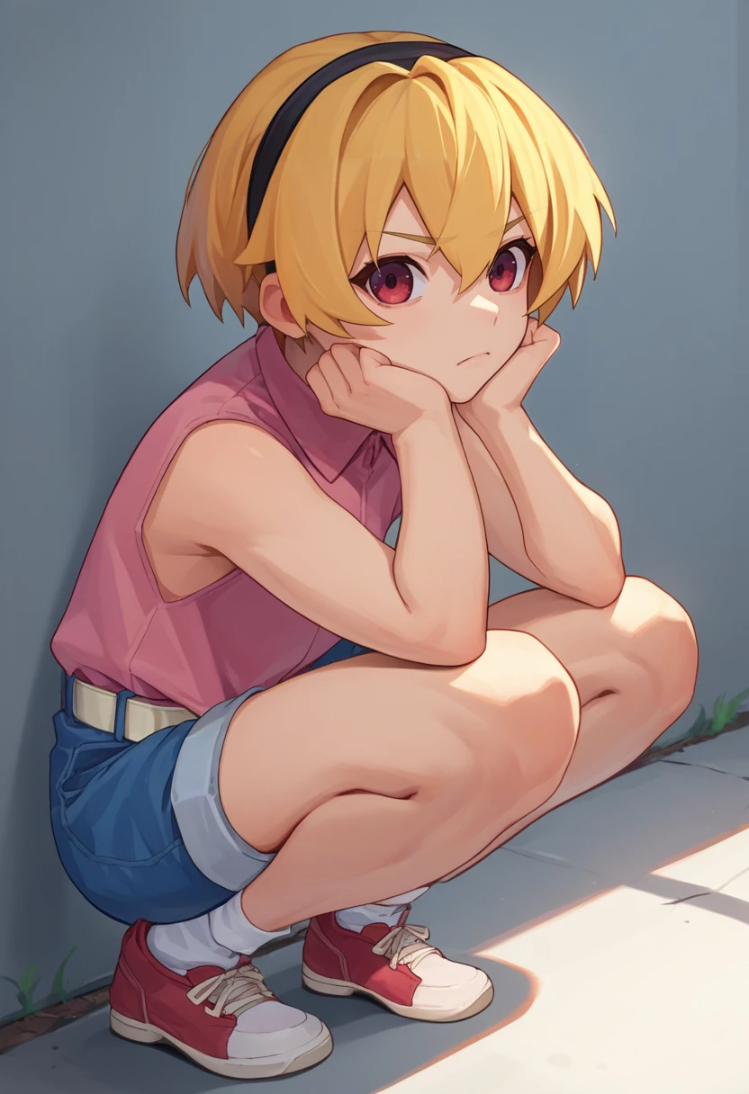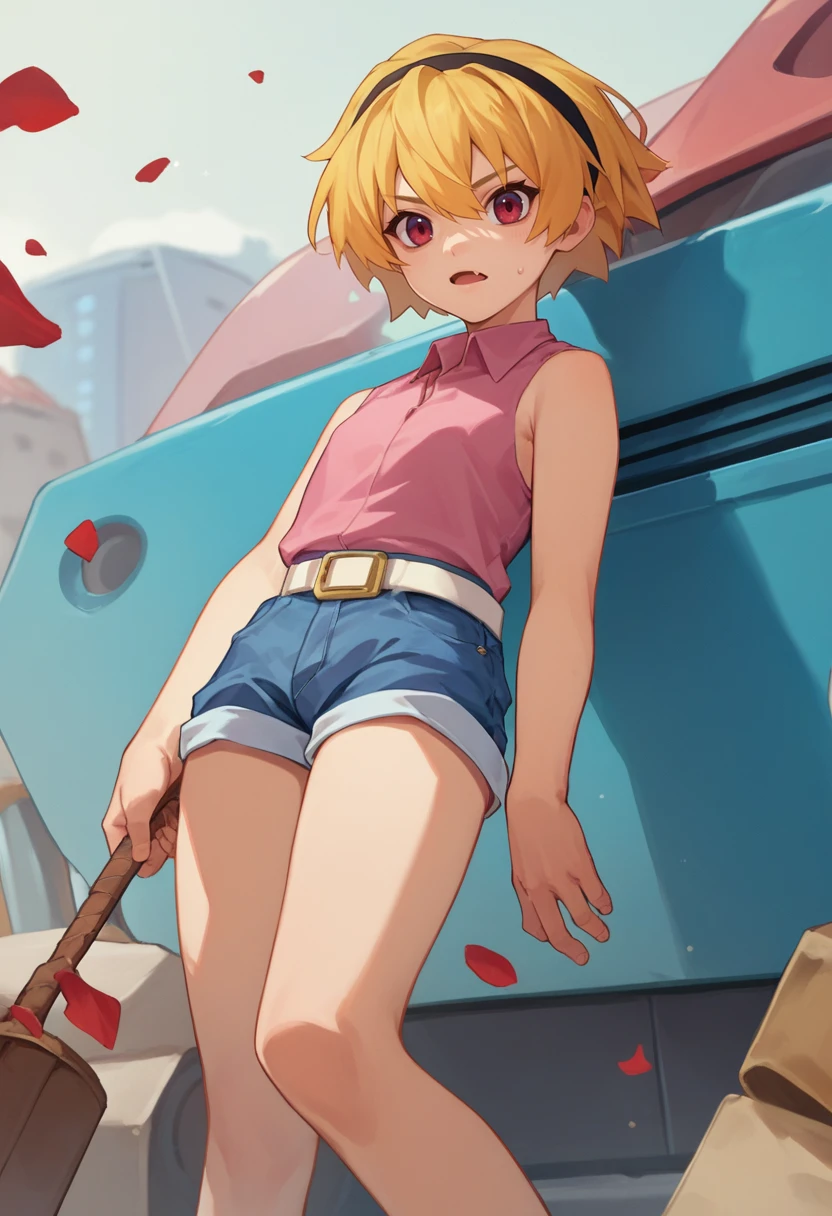 SatoCasual, blonde hair, red eyes, hairband, pink shirt, white belt, denim shorts