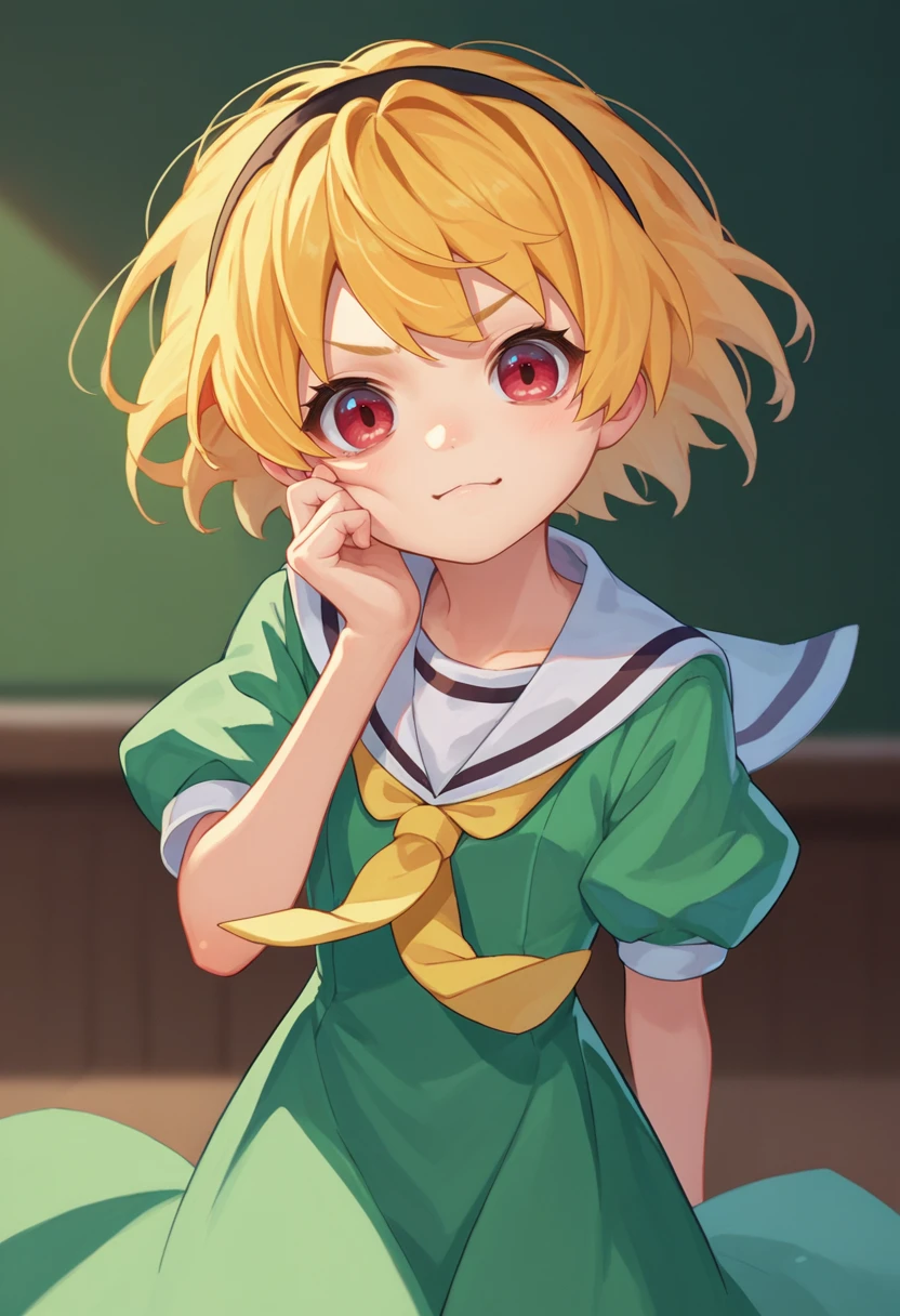 SatokoSchool, blonde hair, red eyes, hairband, sailor collar, yellow necktie, green dress, black pantyhose