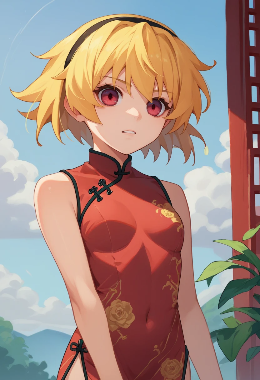 Satornd, blonde hair, red eyes, hairband