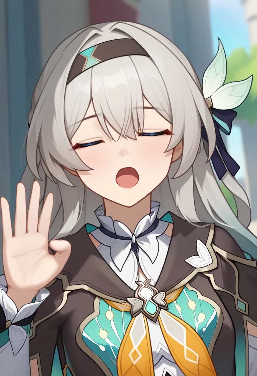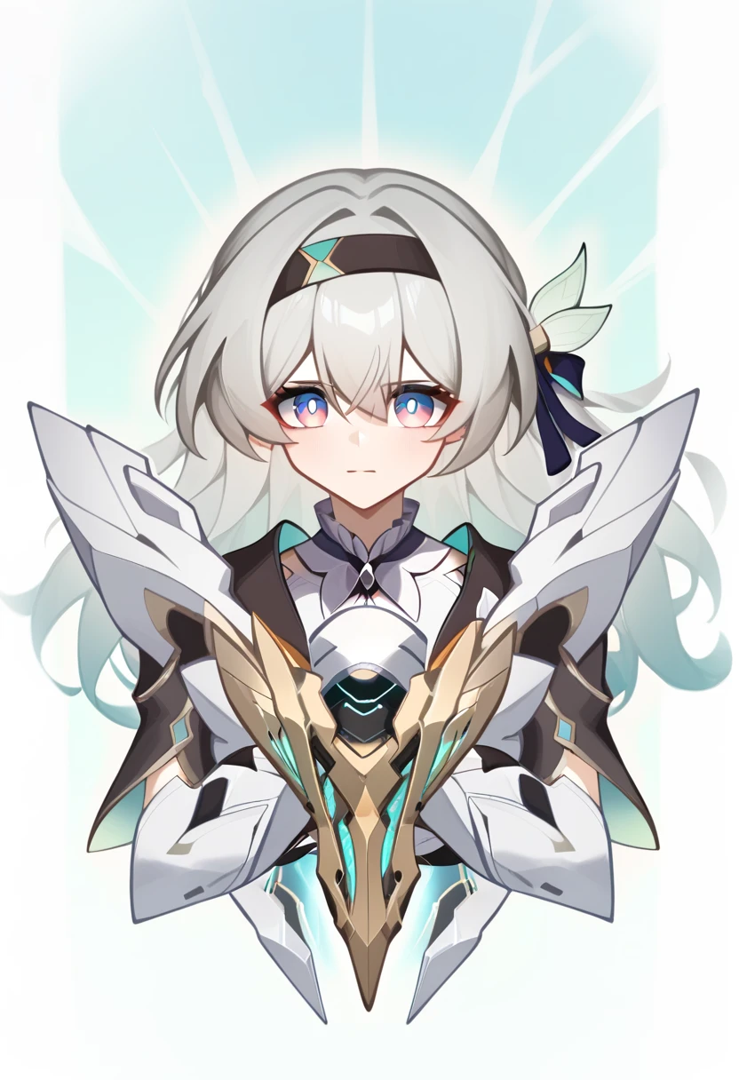 TAG:firefly \(honkai: star rail\),1girl,solo,jacket,white dress,long sleeves,white flower,headband,