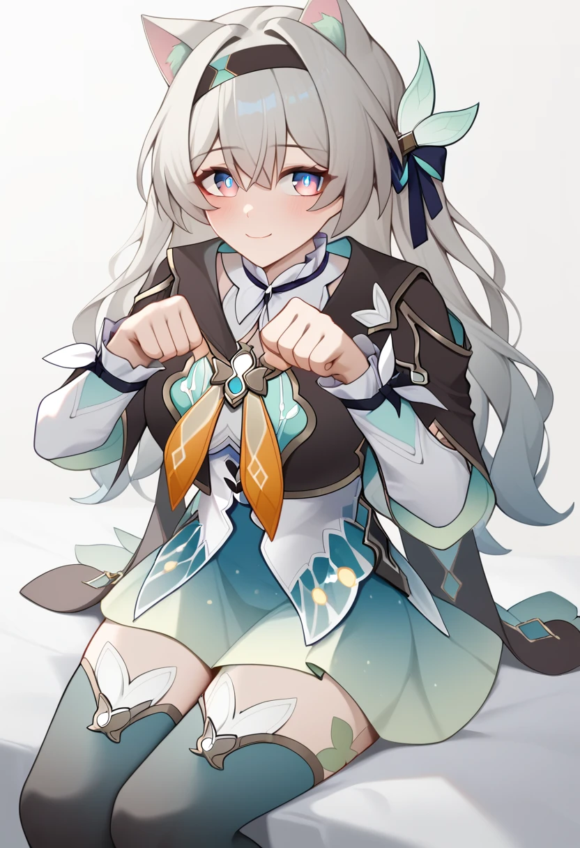 TAG: firefly \(honkai: star rail\), 1girl, solo, white dress, long sleeves, blue thighhighs,jacket