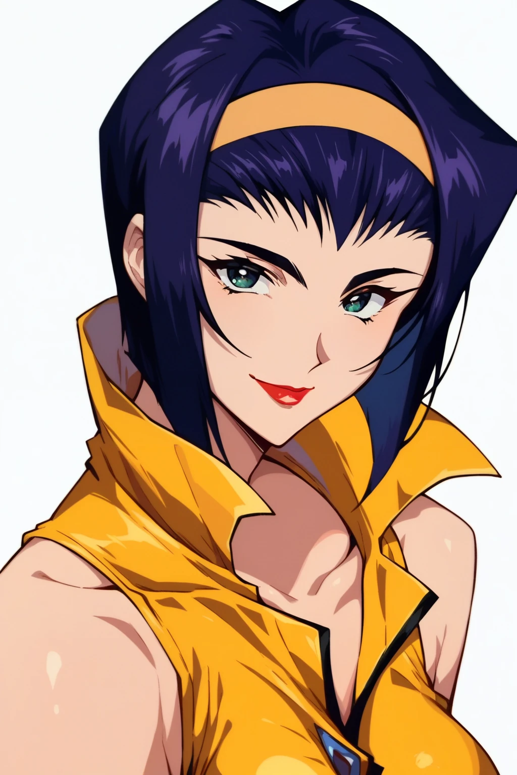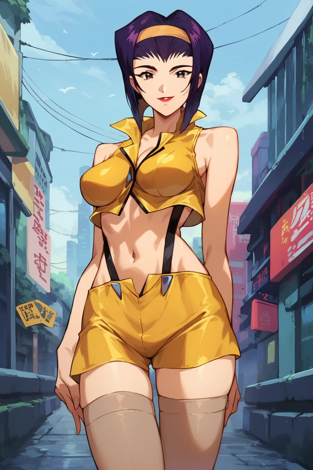 faye valentine, 1girl, hairband, lipstick, yellow midriff, ???? shoulders,  red jacket, navel, suspenders, yellow shorts, grey thighhighs, boots, high heels