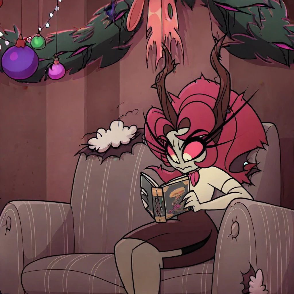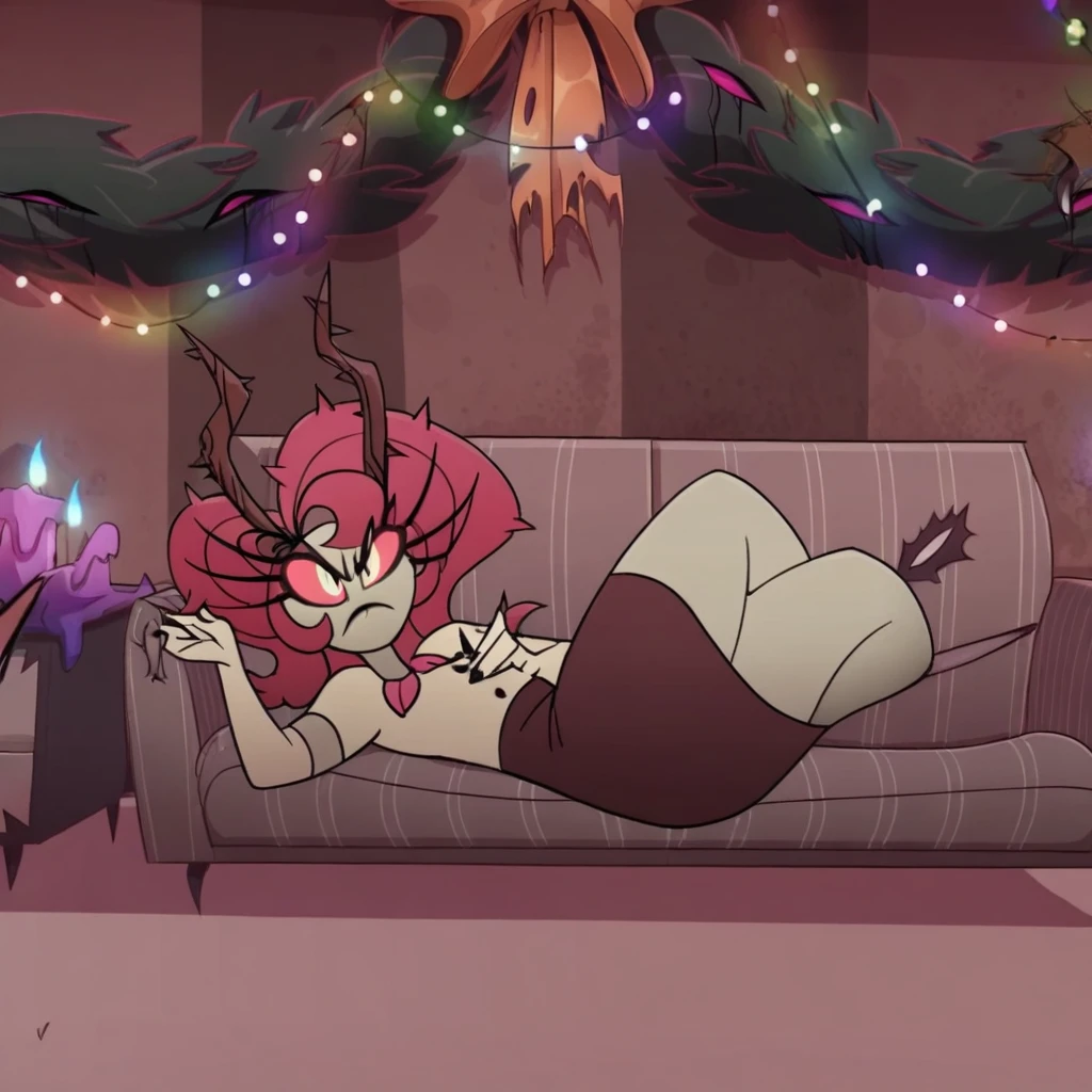 Rosebush_sinner, red hair, gray skin, thorns, antlers, colored sclera, white shirt, button up shirt, gloves, white gloves, elbow gloves, skirt, pencil skirt, brown skirt