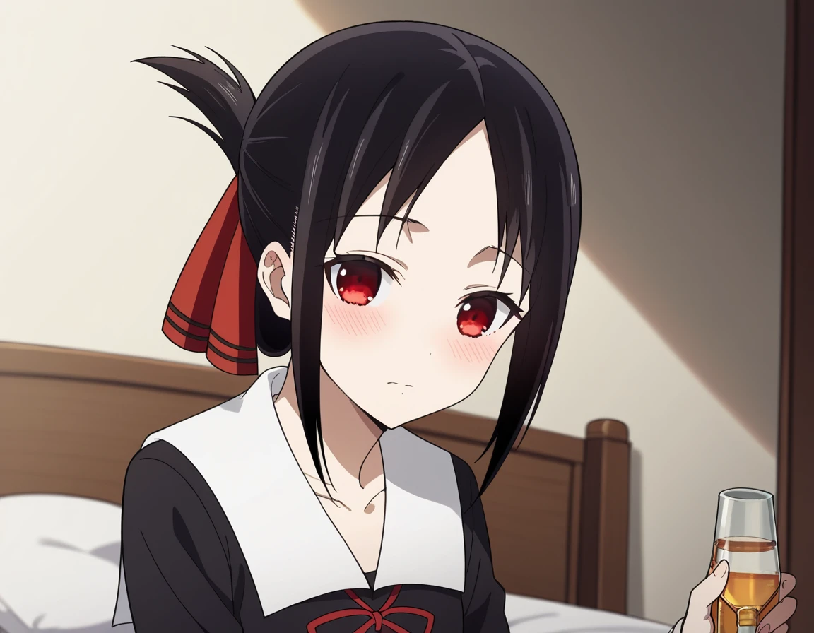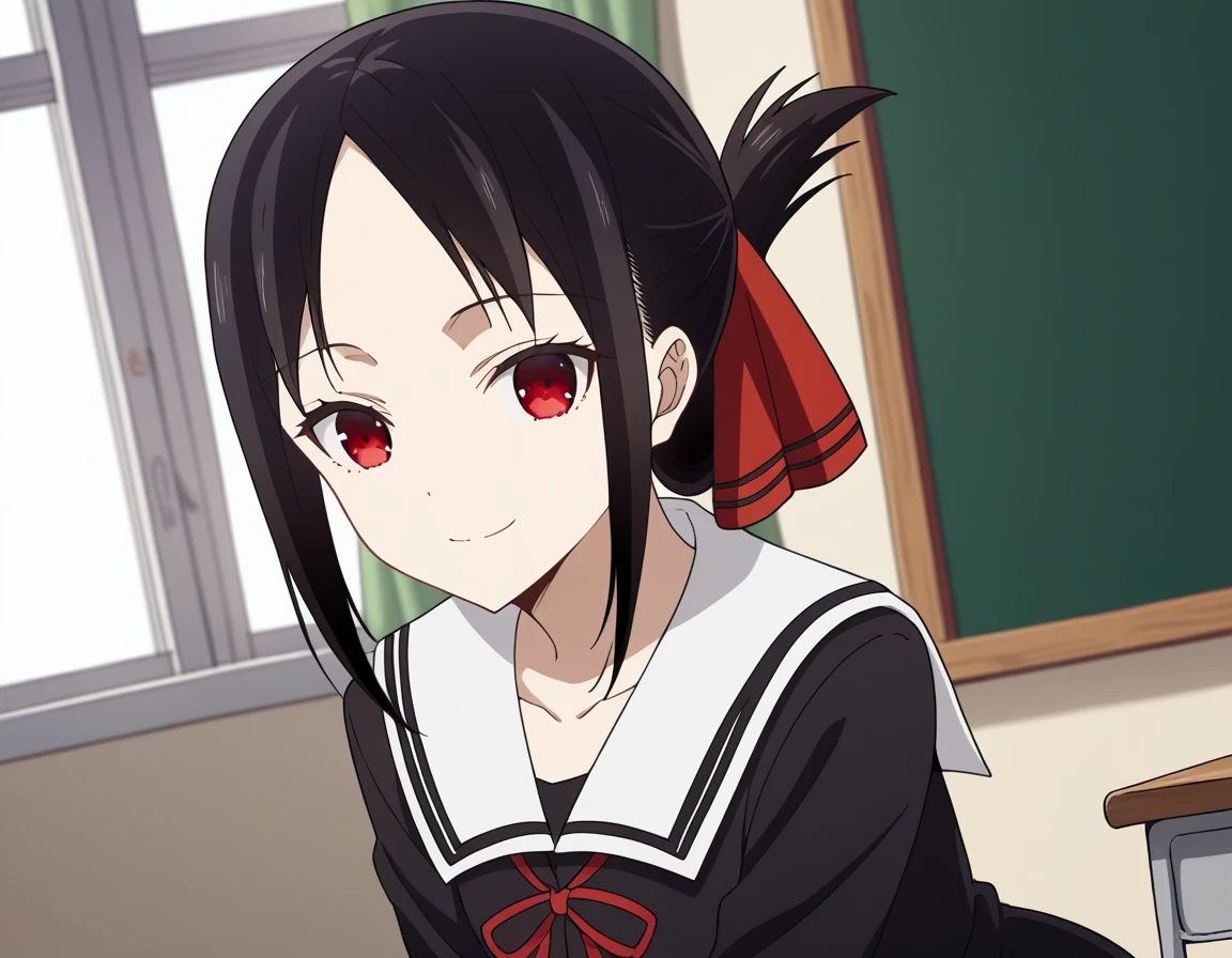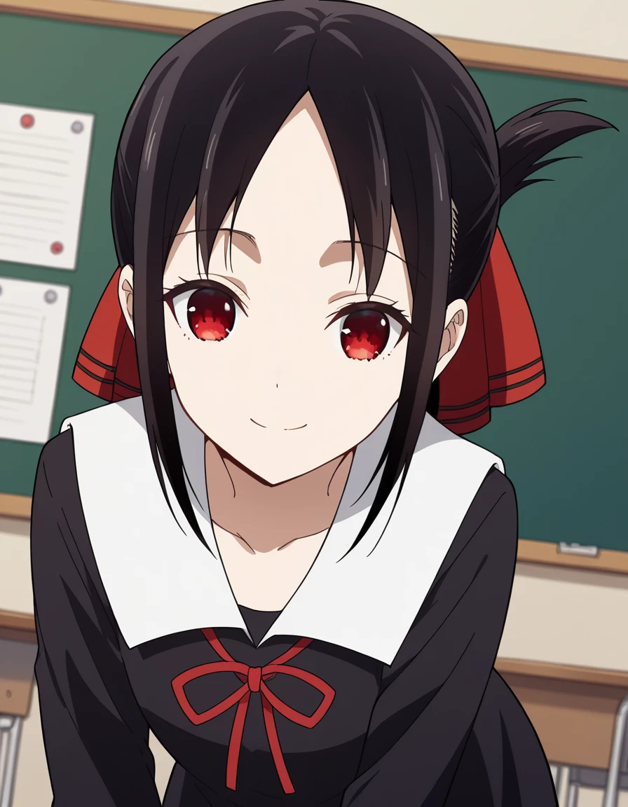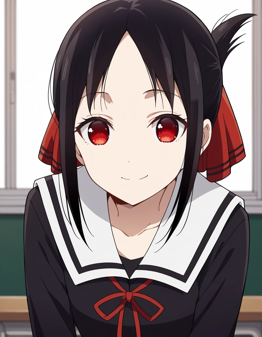 kaguya shinomiya, short hair, bangs, black hair, red eyes, hair ribbon, sidelocks, folded ponytail, parted bangs,