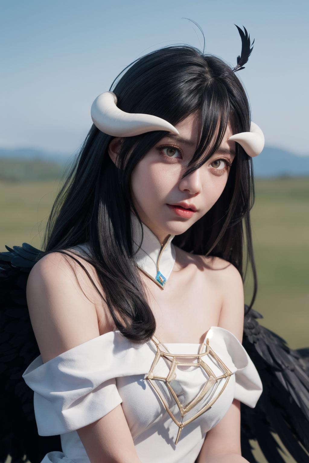 albedo_overlord, hair between eyes, white dress, ???? shoulders, dress, low wings, ahoge, black feathers