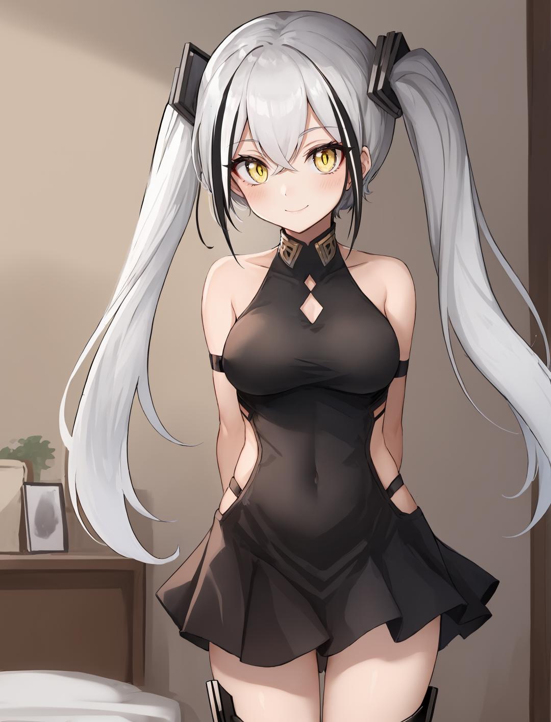<lora:DestroyerNormal:1>,1girl,destroyernormal,white hair,twintails,streaked hair,hair ornaments,sangvis ferri,black short dress,yellow eyes,bare shoulders,sleeveless,gloves,hip cutout,medium breasts,mechanical legs