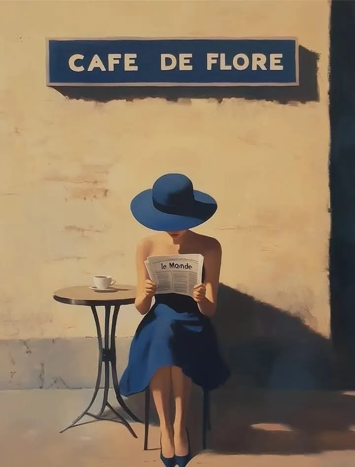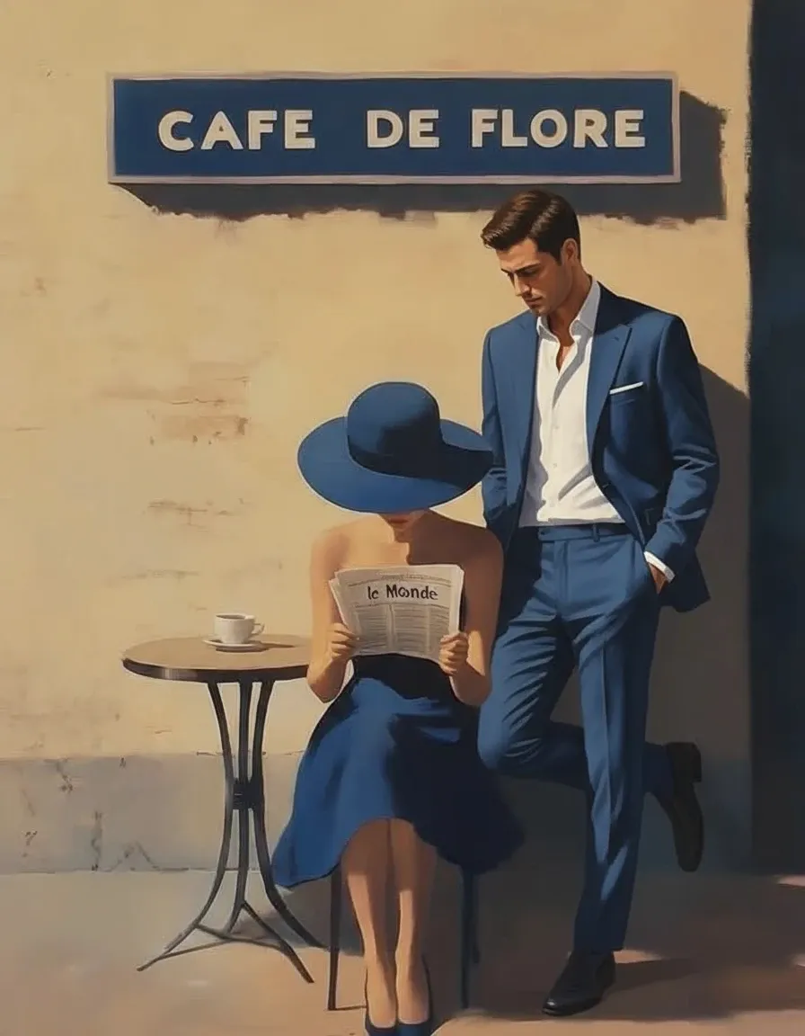 添加一名身穿藍色西裝的男子,白色襯衫,站在女子旁邊, 他正低頭看女子手中的報紙,他的腿舉起到牆後面,他的手插在褲子口袋裡,專注的表情
