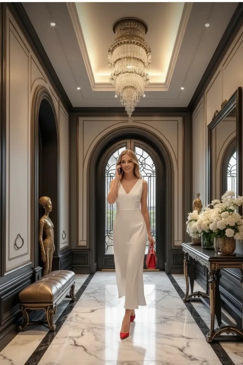 添加一名年輕漂亮的女子,金髮,朝觀眾走來,她穿著一件精緻的白色連衣裙,紅鞋子,她的手拿著一個紅色的小奢侈品包,另一隻手拿著手機貼在耳邊,她正在通電話並微笑