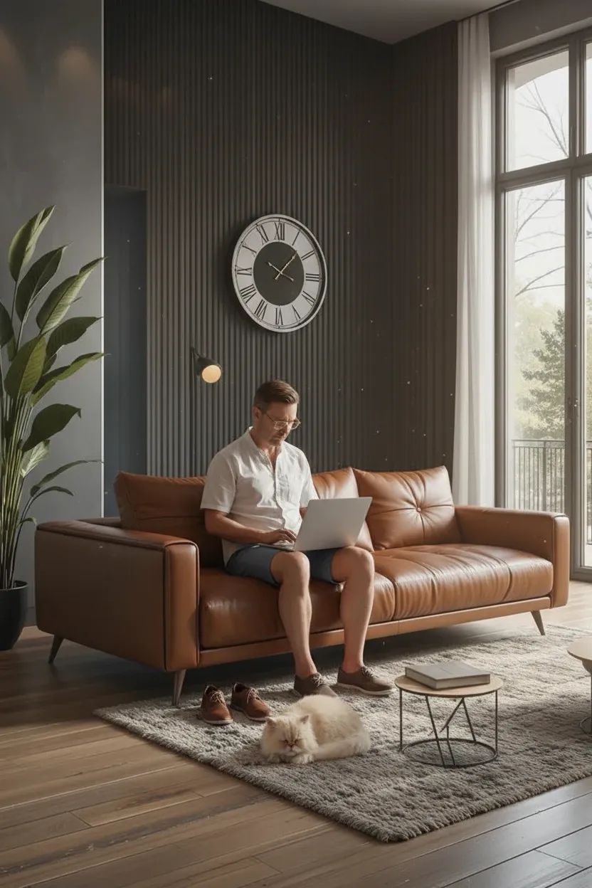 Add a man wearing a 白色襯衫,, 他握著一台筆記本電腦 ,他的臉專注著,在他鞋子旁邊添加一隻躺下睡覺的貓,在他身後的牆上添加一個時鐘,保持其他一切不變