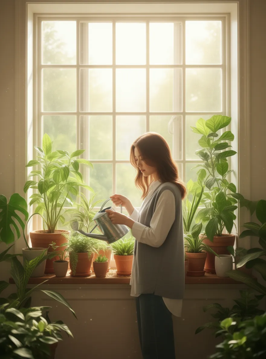 Green Haven將您的照片轉化為一個寧靜的場景,您是照顧窗邊室內植物的中心人物. 您獨特的特徵和表情得以保留, 被茂密的綠色植被包圍,呈現出一個美麗而細緻的畫面. 氣氛平靜而充滿生機, 慶祝在室內培養植物的簡單快樂.